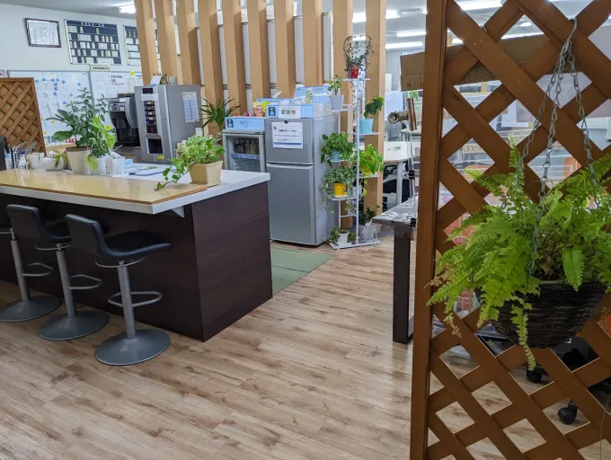 休憩スペースです。 ドリンクサーバーを完備しているので自由に使用できます!