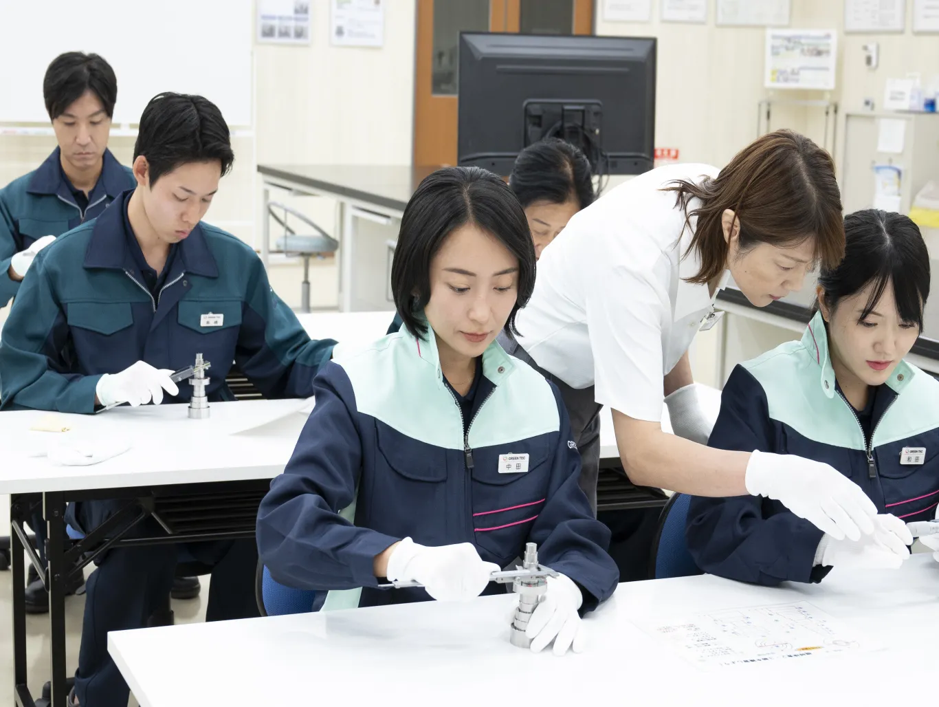 入社後は、社内研修施設にて研修を行い、測定スキルから組み立て、検査の知識、技術を学んだ後、OJTに入り実践で経験を積んでいただきます。
